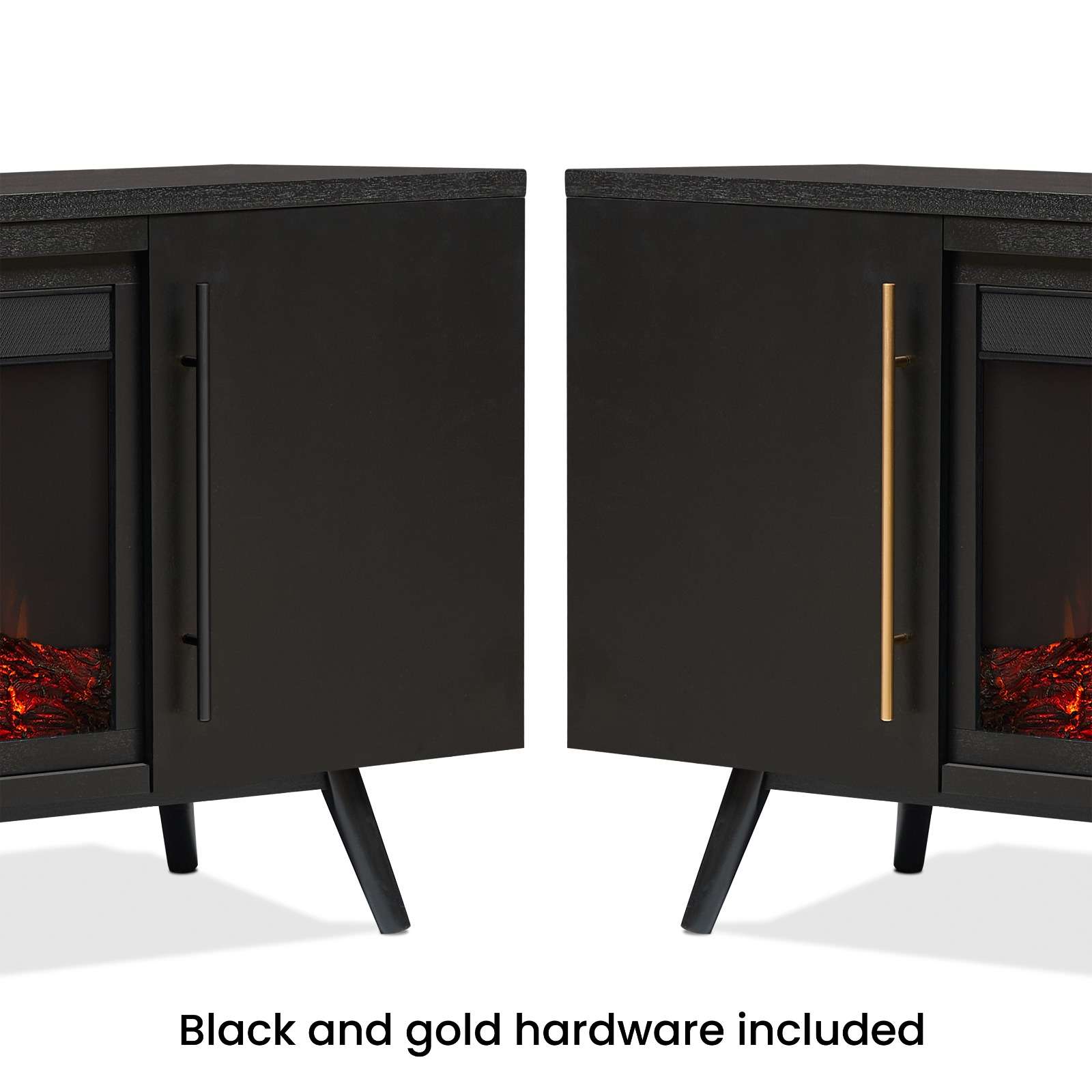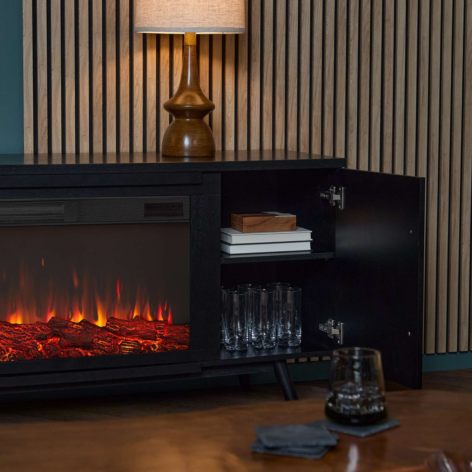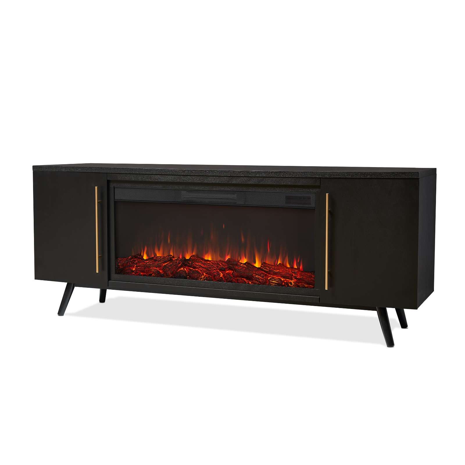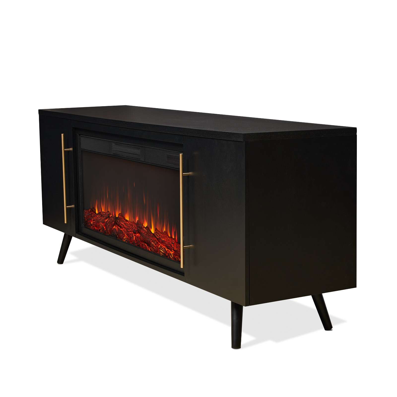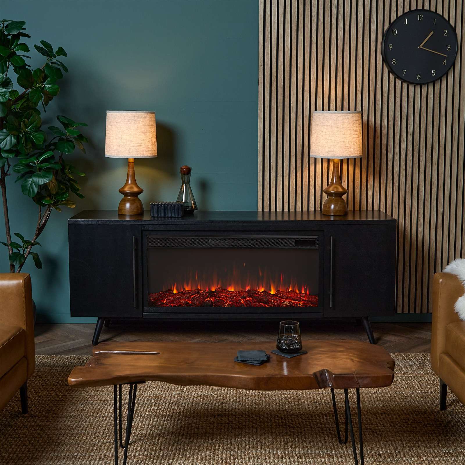 | With clean lines, tapered legs and minimalist hardware, the Morris electric fireplace embodies the iconic mid-century modern aesthetic. Enjoy the modern functions of this fireplace and practical storage possibilities while staying true to your style. Part of the Real Flame® VividFlame™ Landscape Series, the widescreen electric firebox mimics the look of a real, flickering fire, but does not require a chimney or vents and conveniently plugs into a standard outlet. This free-standing, extra-long fireplace entertainment center can accommodate TVs up to 70". Features a mantel with a real wood finish, six flame colors, five flame brightness levels, adjustable thermostat, timer function and automatic safety shut-off. The electric fireplace insert provides supplemental heat for rooms up to 1,000 sq ft or the heater can be turned off so you can enjoy the comforting ambiance of a glowing fireplace year-round. Mantel, firebox with log set, hardware and remote control are included.
